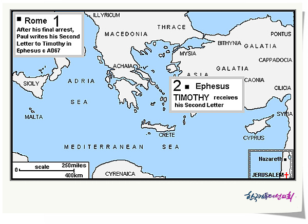 µð¸ðµ¥Èļ­(2Timothy) 1. ¹è°æ µð¸ðµ¥Èļ­´Â ¹Ù¿ï ¼­½ÅÁß ÃÖÈÄÀÇ °ÍÀ¸·Î µÎ¹øÂ° ·Î¸¶¿¡ °¤ÇôÀÖ´Â µ¿¾È¿¡ ±â·ÏÇÑ °ÍÀÌ´Ù. ÁÖÈÄ 67³â °æÀ̾úÀ» °ÍÀÌ´Ù. Àü¼³¿¡ ÀÇÇÏ¸é ¹Ù¿ïÀº ·Î¸¶¿¡¼­ ÀÏ´Ü ¼®¹æµÇ¾î ±×ÈÄ ¼­¹Ý¾Æ¿¡ °¬´Ù°¡ ´Ù½Ã µ¿¹æÀ¸·Î ¿Í¼­ °í¸°µµ¿Í ¹Ð·¹µµ¸¦ °ÅÃÄ(µõÈÄ4:20), µå·Î¾Æ±îÁö °¬´Ù°¡(µõÈÄ4:13) µå·Î ...